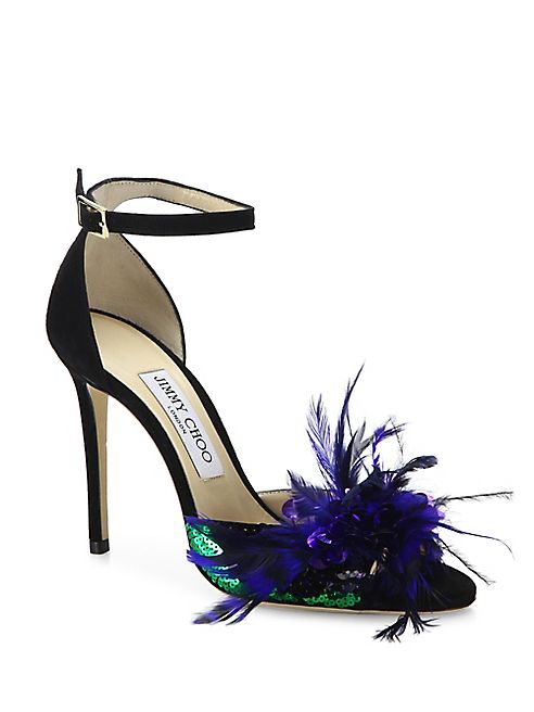 Jimmy Choo - Annie Sequin & Feather-Embellished Suede Ankle-Strap Sandals