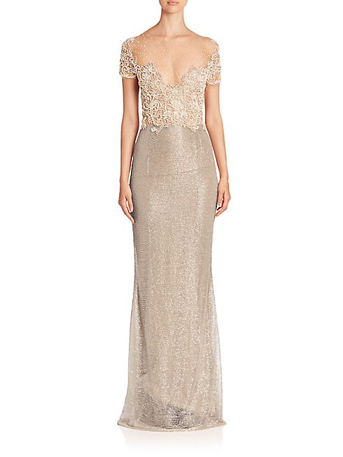 Monique Lhuillier - Embroidered Long-Sleeve Illusion Gown