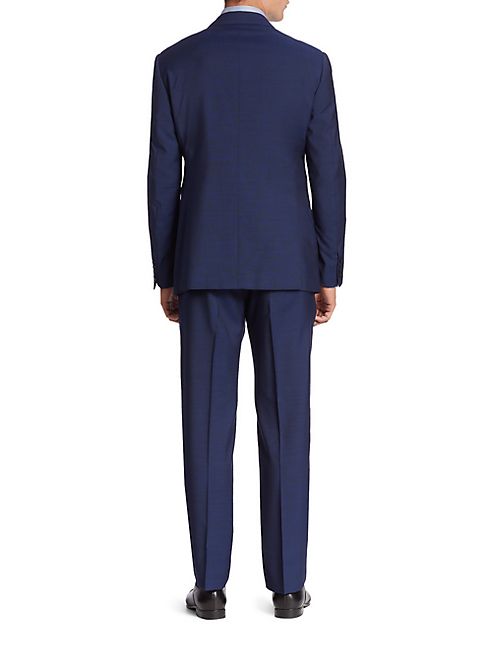 Plush wool two-button suit rendered in tonal design. Wool. Dry clean . Imported