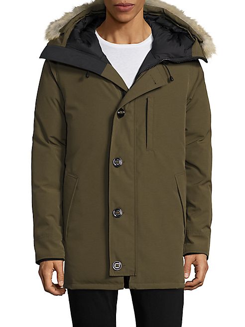 Detachable coyote fur-trimmed lends warmth and versatility to this winter staple