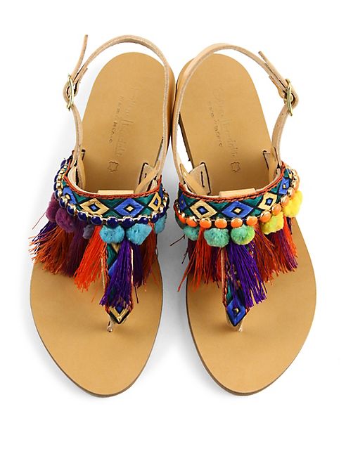 Colorful embroidered sandal with tassel and pom trim