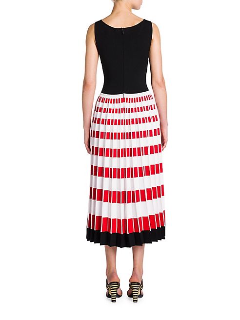 Pleated striped skirt emboldens sleeveless knit dress