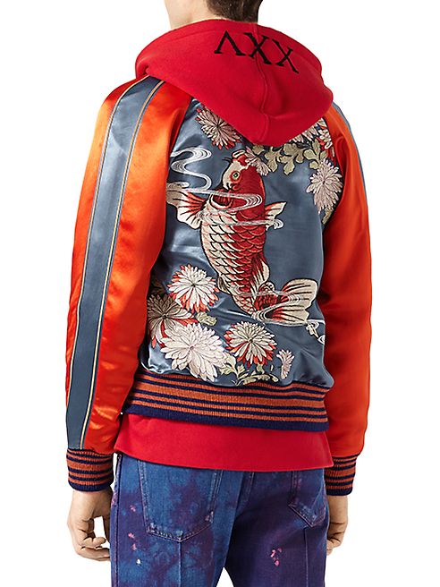 The bomber jacket, an essential cut carried season to season, is embellished with embroidered floral appliqués down the chest and along the back. The back is further enriched with a large embroidered koi fish, an image often associated with good fortune, abundance, and courage.