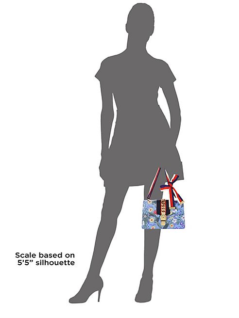 The small structured Sylvie bag with a chain shoulder strap and grosgrain Sylvie Web bow. The nylon Web is embedded under the leather and decorated with a goldtone chain and buckle. Made in our natural grain leather with the New Flora print. The New Flora print is a stunning cascade of colorful flowers from every season set against a solid backdrop.