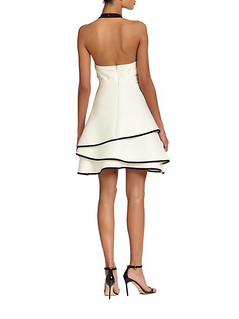 A fit-and-flare halter dress accented with contrast details and a tiered, ruffled skirt for added feminine charm.