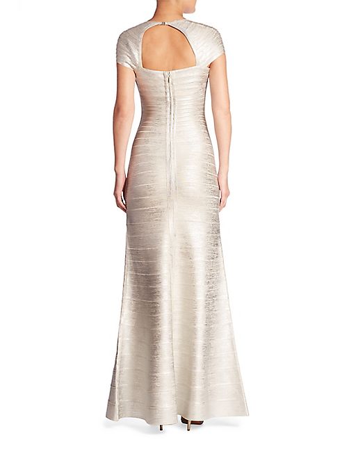 :Herve Leger - Foiled Cap-Sleeve A-Line Gown