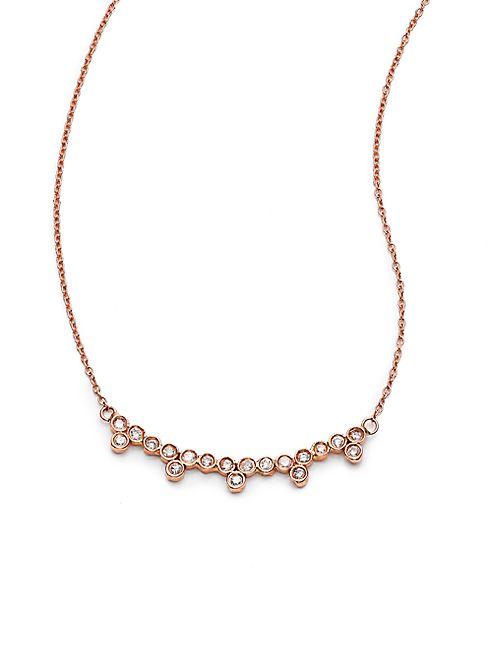 Fourteen petite diamonds, with five accenting solitaires set below, incandesce in an arc of soft, delicate shimmer, upon a chain of 14k rose gold.