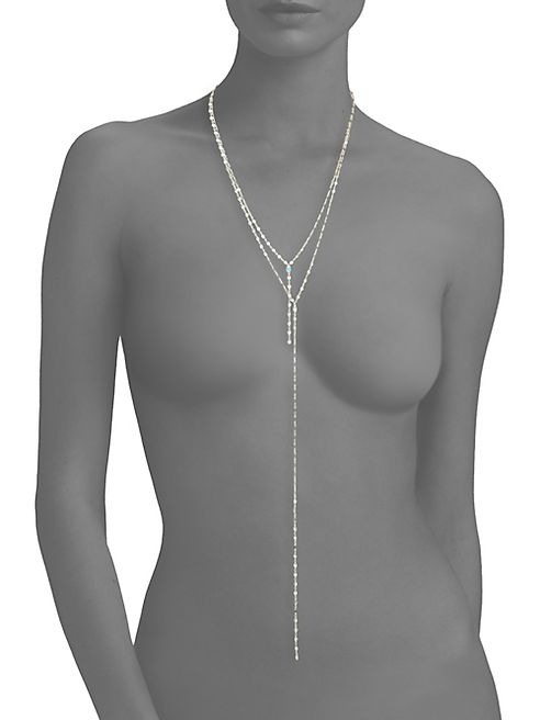 Layered lariat necklace, with mixed delicate chains