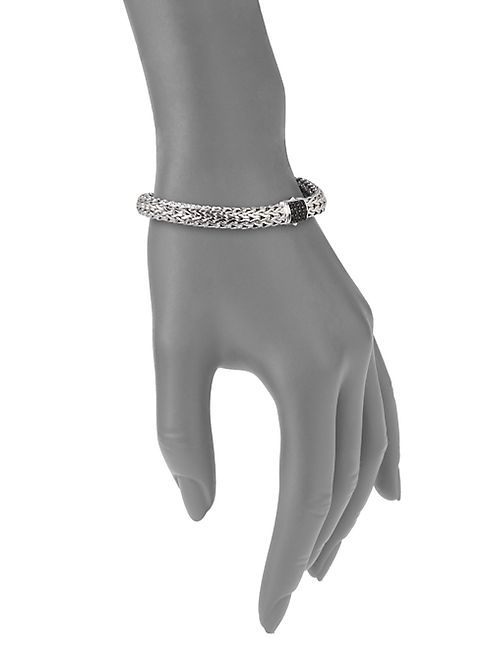 From the Classic Chain Collection. A John Hardy signature design, of strands of sterling silver woven to shape an intricate chain bracelet, accented with a clasp of rich black sapphire pavé.