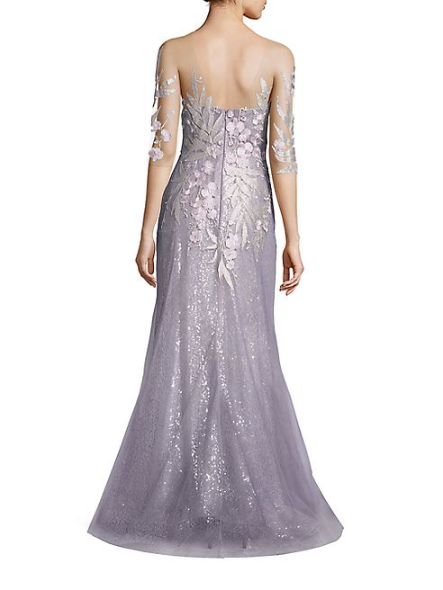 :Liancarlo - Three-Quarter Sleeve Embroidered Tulle Sequin Gown