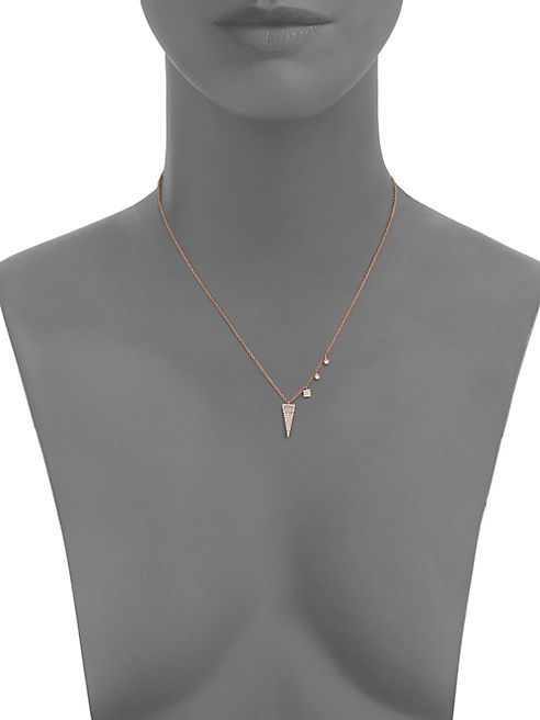 A sharp inverted triangle of softly shimmering design. This petite pendant is cast of a 14k rose gold setting awash in diamond pavé, displaying the pale pink glow of a doublet of rose quartz upon mother-of-pearl, with delicate accenting charm detail set in asymmetry at one side.