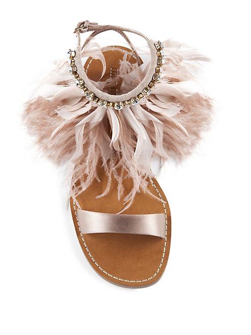Boho-chic flat feathered sandal with jeweled trim