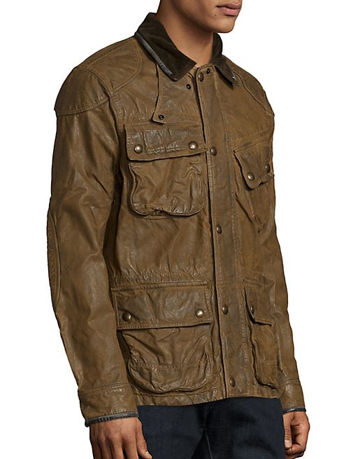 Made from waxed oilcloth for a leatherlike look, this design is a tactile twist on the classic, four-pocket moto jacket