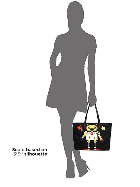 Sleek nylon tote with studded saffiano robot motif