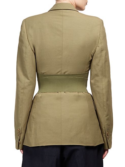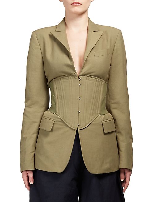 The juxtaposition of boning and corsetry with utilitarian-inspired tailoring create a perfect balance in this streamlined jacket. A recurring motif throughout the Spring 2017 collection, corseted detailing offers this look effortless flair.