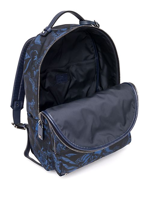 Valentino's signature Rockstud accents with rich ruthenium finish punctuate this backpack, its body featuring a crisp, photo-real butterfly print in a shade of bright cobalt blue, with the complement of sleek sapphire leather trim.