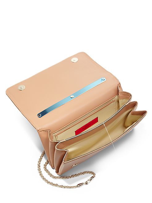 A smooth, supple nappa leather bag that features arresting adornment: a woven chain strap laced through sculptural hardware, and a front hand strap accented with an array of pyramid studs, all in sleek silvertone metal.
